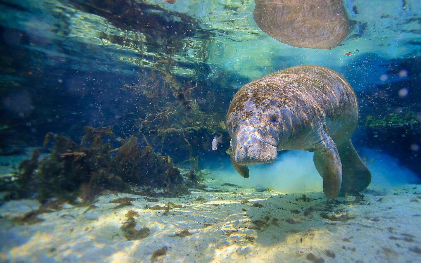 If you’re wondering what exactly to look for, really just keep your eyes out for a large mass of light color near the surface of the water. (And I really do mean large: The average male can grow up to 10 feet long and weigh between 800 to 1,200 pounds. That’s a big sea cow!)